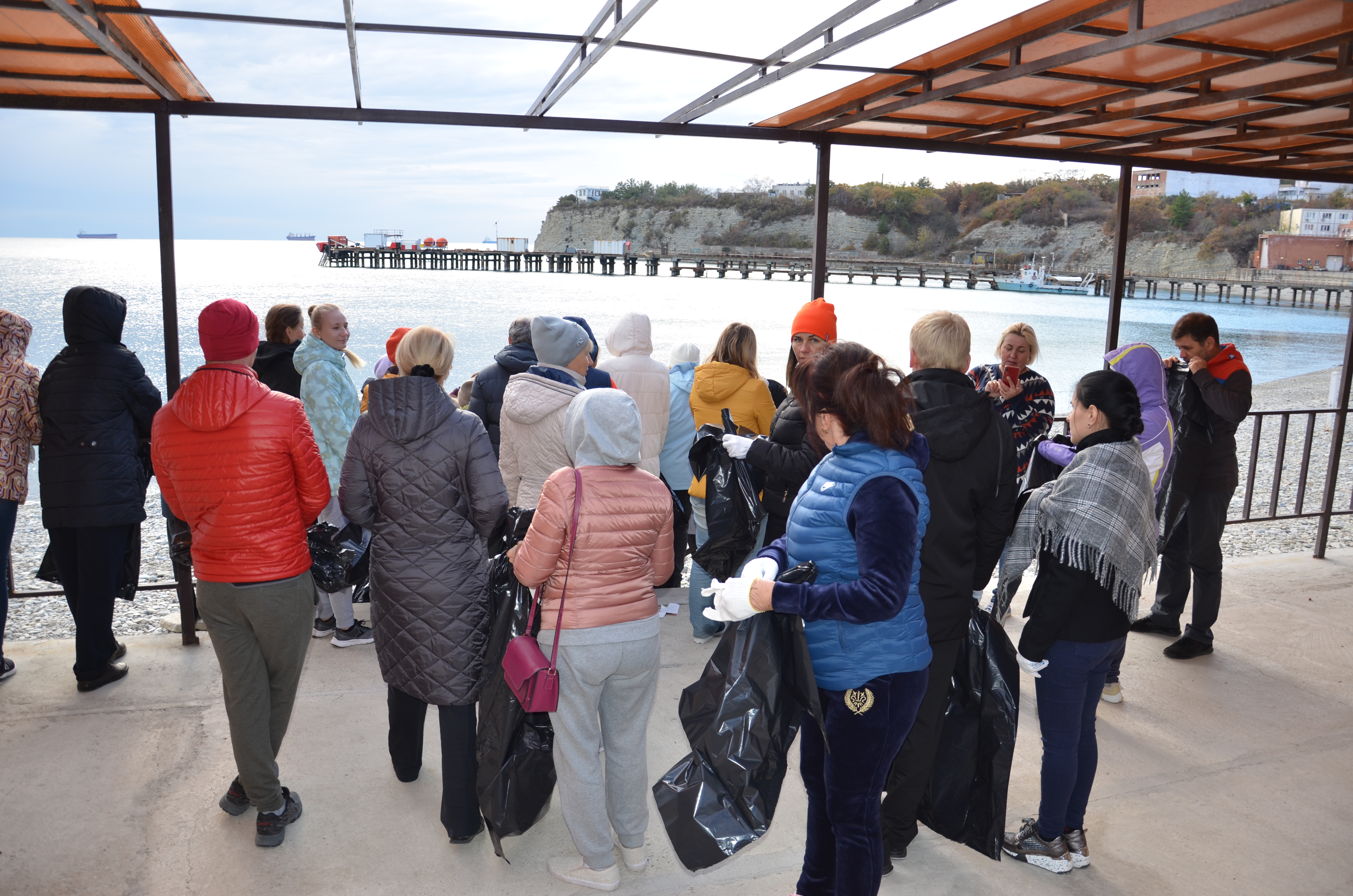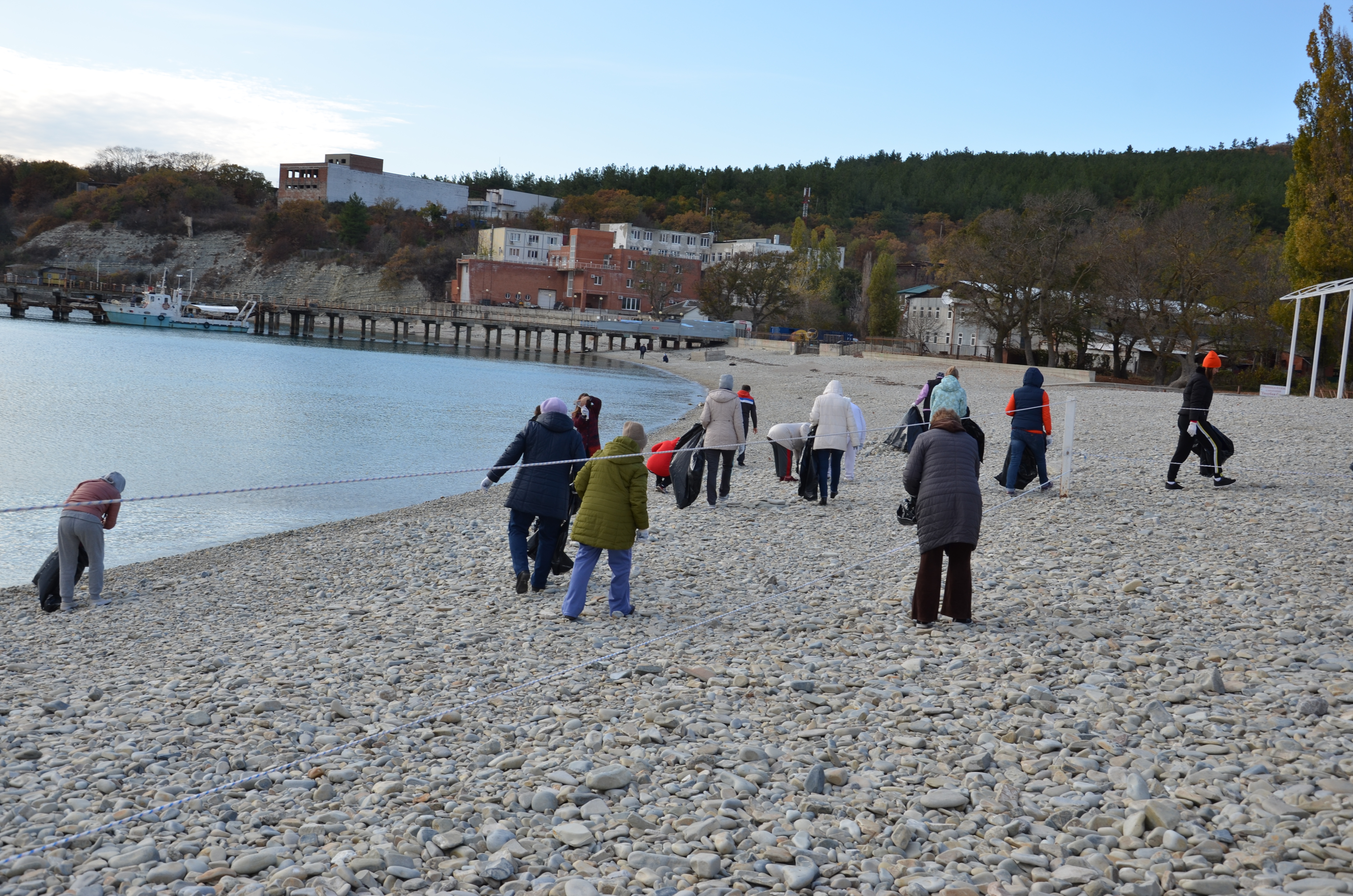 Не смотря на холодную для октября погоду, наши отдыхающие (а их было более сорока человек), вооружившись перчатками и полиэтиленовыми мешками, решили внести свой вклад в экологическое состояние Черного моря. Порядок наводили на берегу нашей замечательной Голубой бухты.