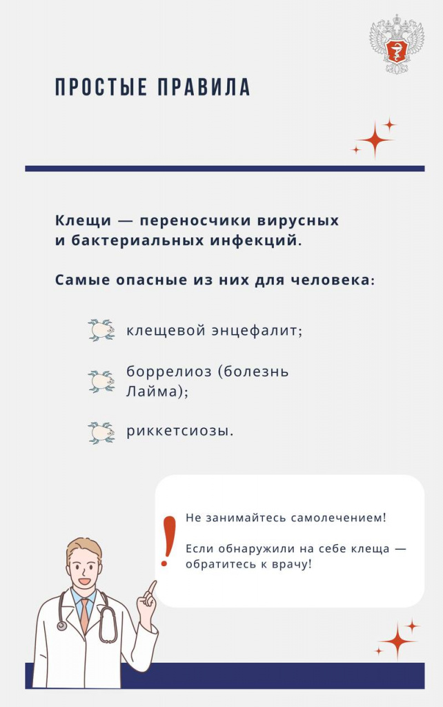 Клещи — переносчики многих опасных вирусных и бактериальных инфекций. Поэтому важно уметь от них правильно защищаться. Расскажем как — читайте в наших карточках.