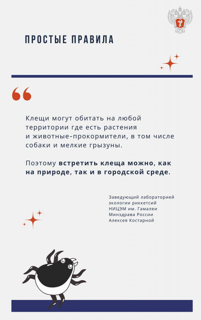 — Клещи могут обитать на любой территории где есть растения и животные-прокормители, в том числе собаки и мелкие грызуны. Поэтому встретить клеща можно, как на природе, так и в городской среде, — рассказал заведующий лабораторией экологии риккетсий НИЦЭМ им. Гамалеи Минздрава России Алексей Костарной.