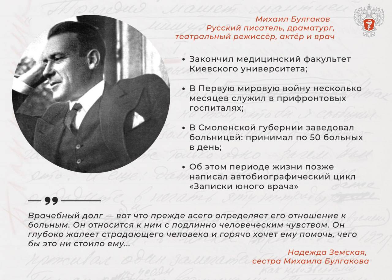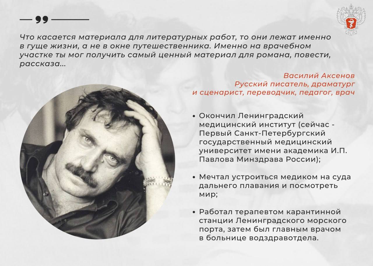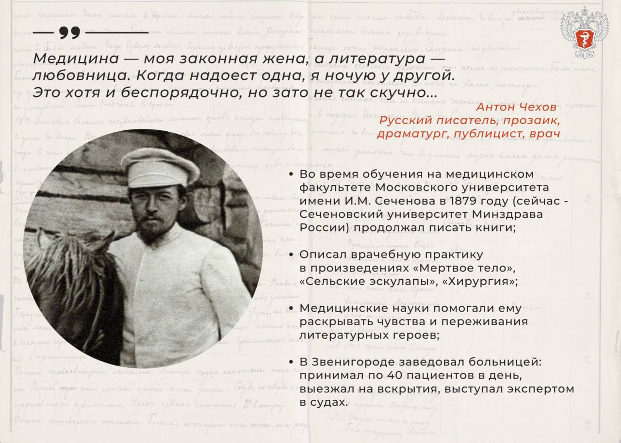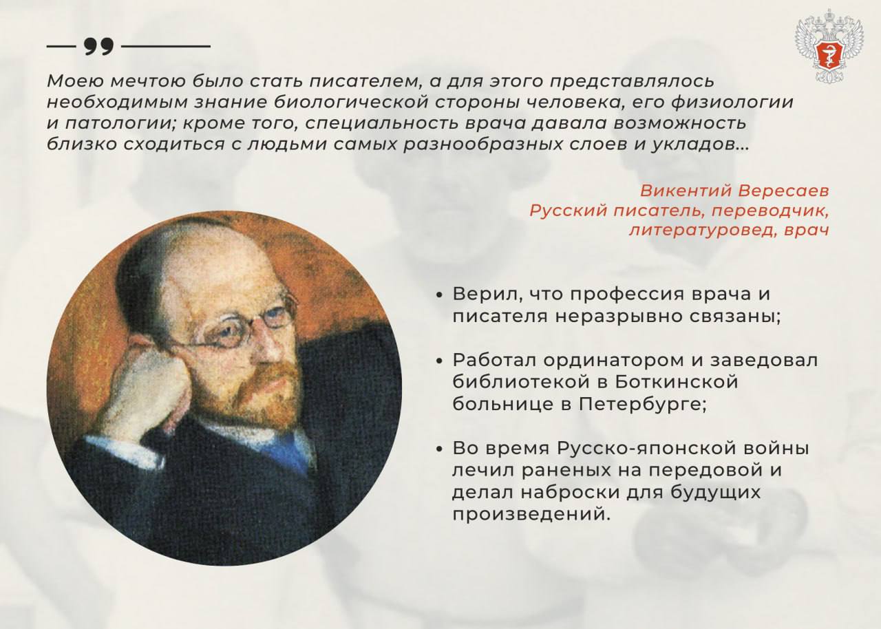 Антон Чехов, Викентий Вересаев, Василий Аксенов, Александр Бородин, Михаил Булгаков получили медицинское образование и совмещали писательство с врачеванием.