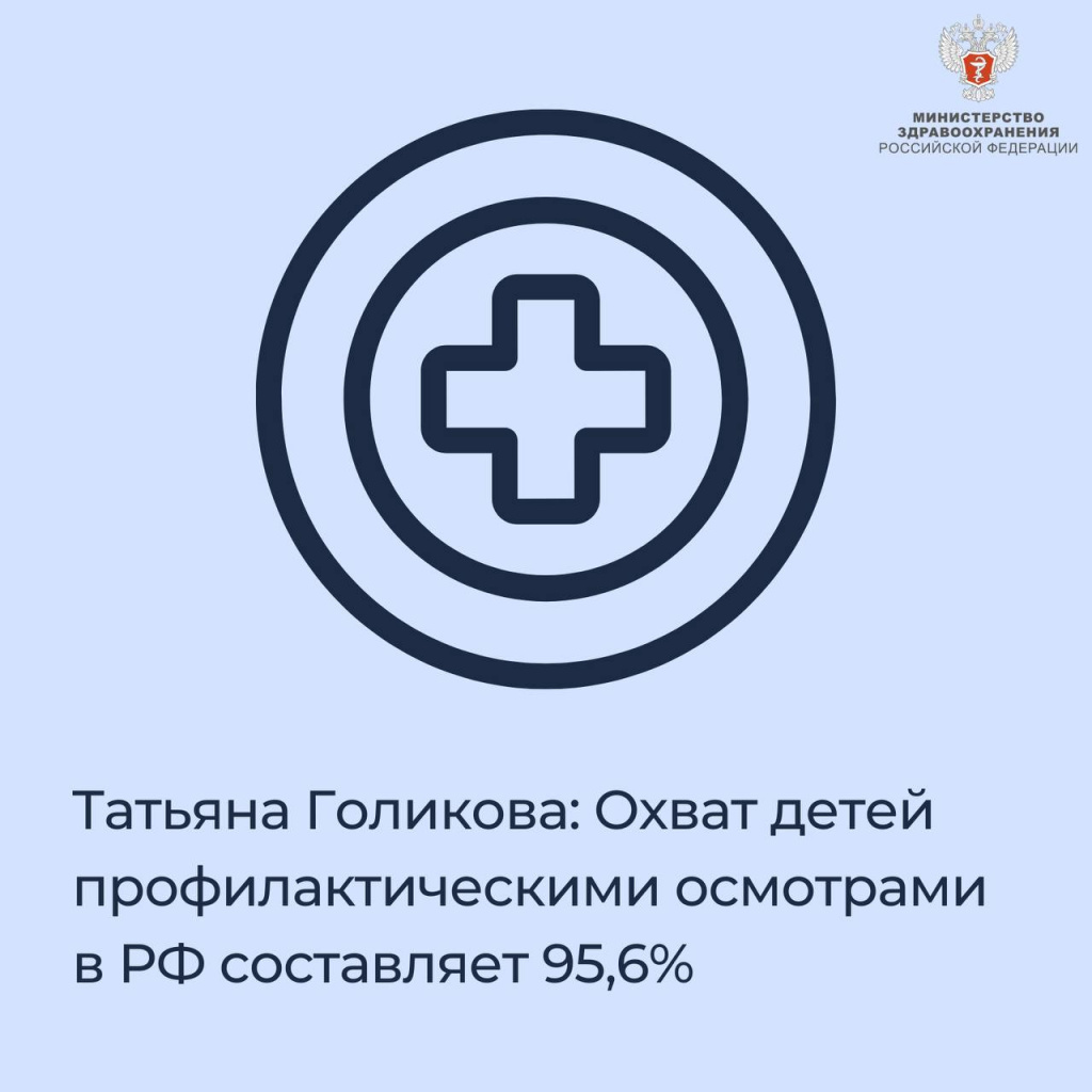 — Наращиваем объемы ежегодных профилактических медицинских осмотров: в 2022 году их прошли почти 26 млн детей, или 93% подлежащих осмотру. По оперативным данным, в 2023 году охват детей профосмотрами увеличился до 95,6%, — сообщила (https://tass.ru/obschestvo/19919839) вице-премьер РФ Татьяна Голикова.