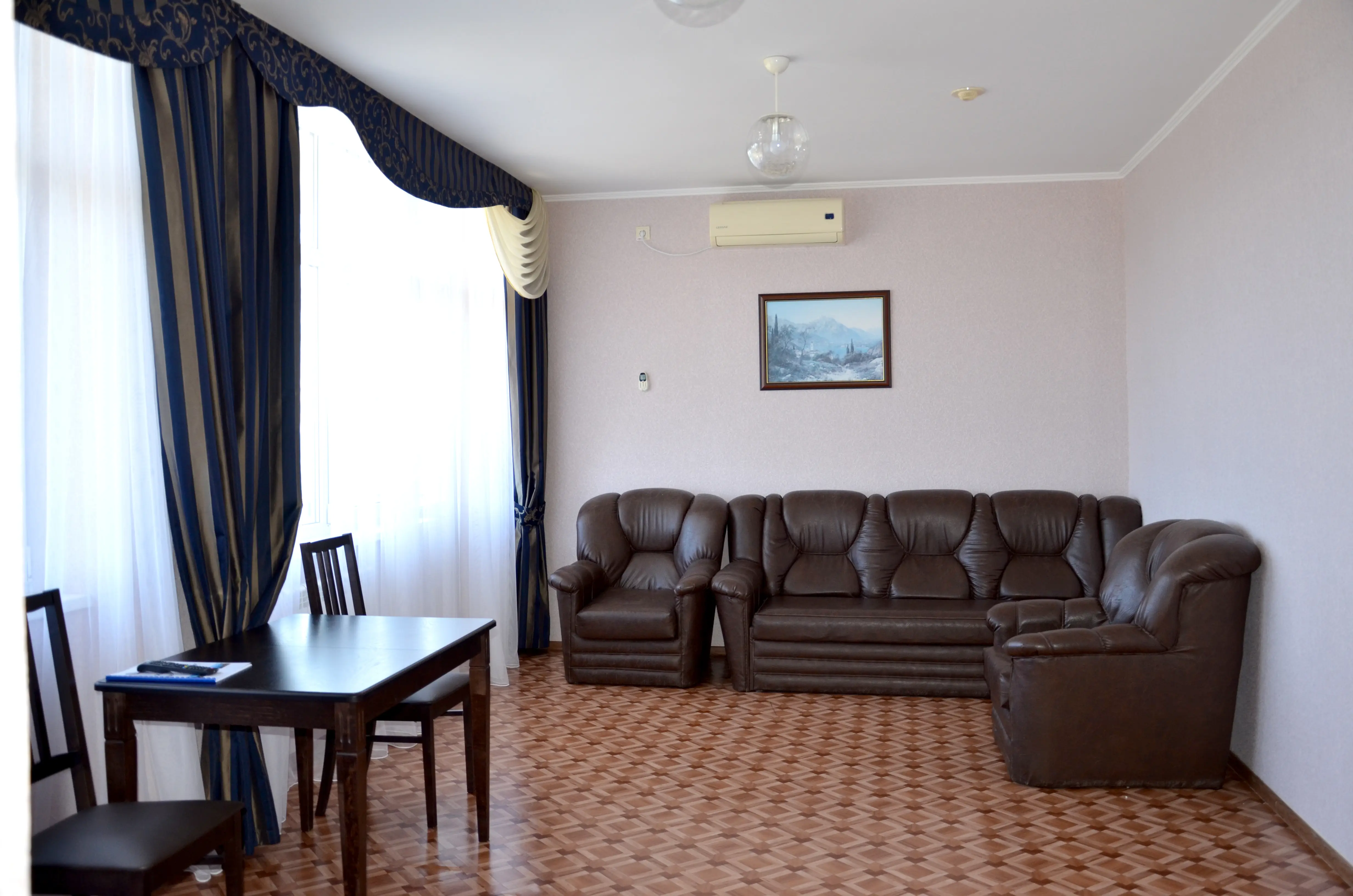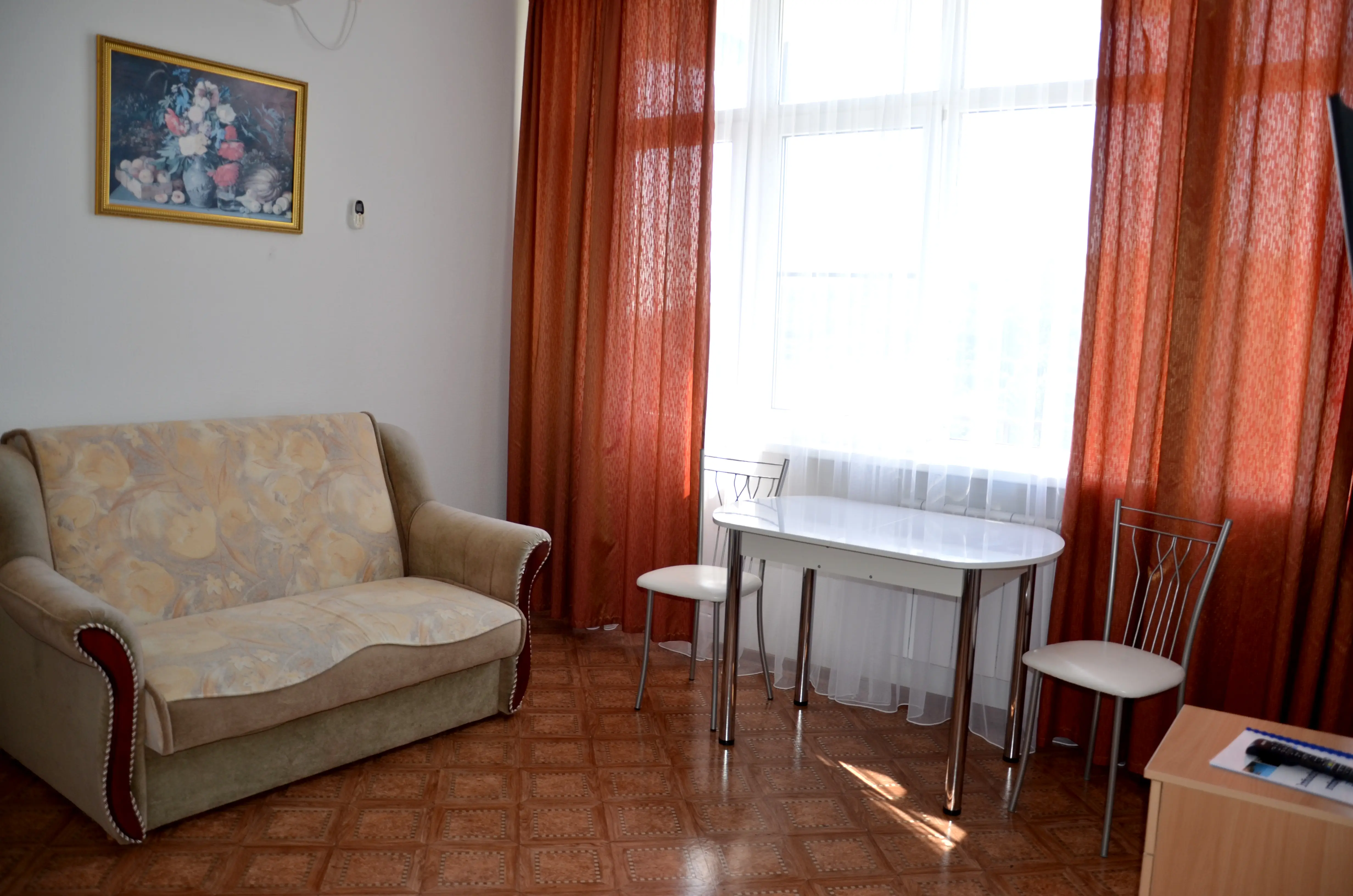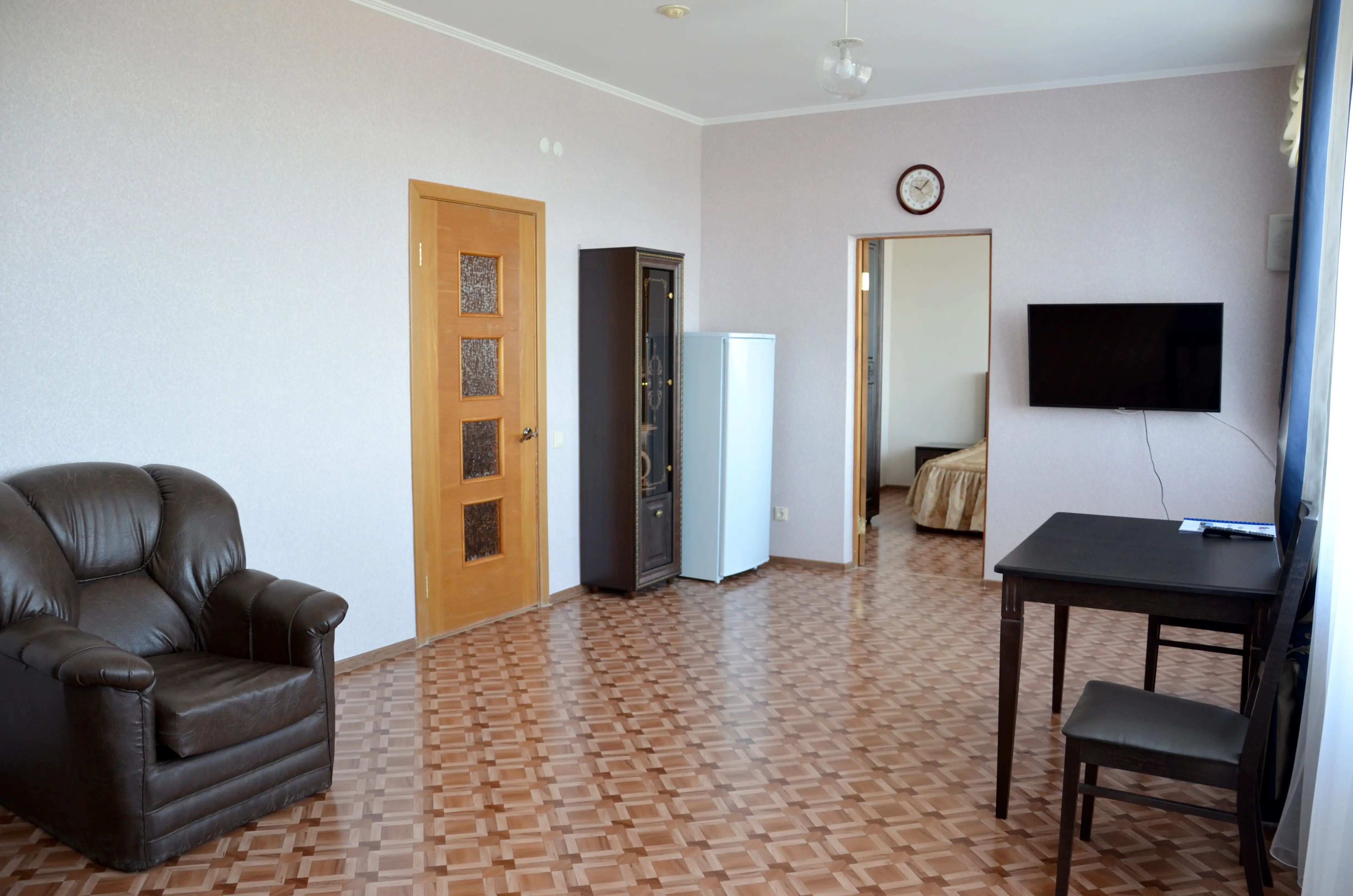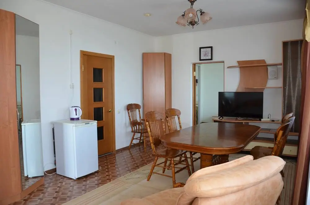Комфортабельный светлый номер из 2 комнат площадью 23 и 14 кв.м., разделенных дверью, где будет удобно и комфортно отдыхать . В ''Люксе'' есть все необходимое для проживания и отдыха. По всему периметру номера – балкон, выход на балкон из гостиной и из спальни, на балконе – летняя мебель ( раскладной стол и два пластиковых кресла). На окнах установлены москитные сетки, предусмотрены раскладные сушилки для белья на балконе. В наличии гладильная доска, утюг, фен для сушки волос.