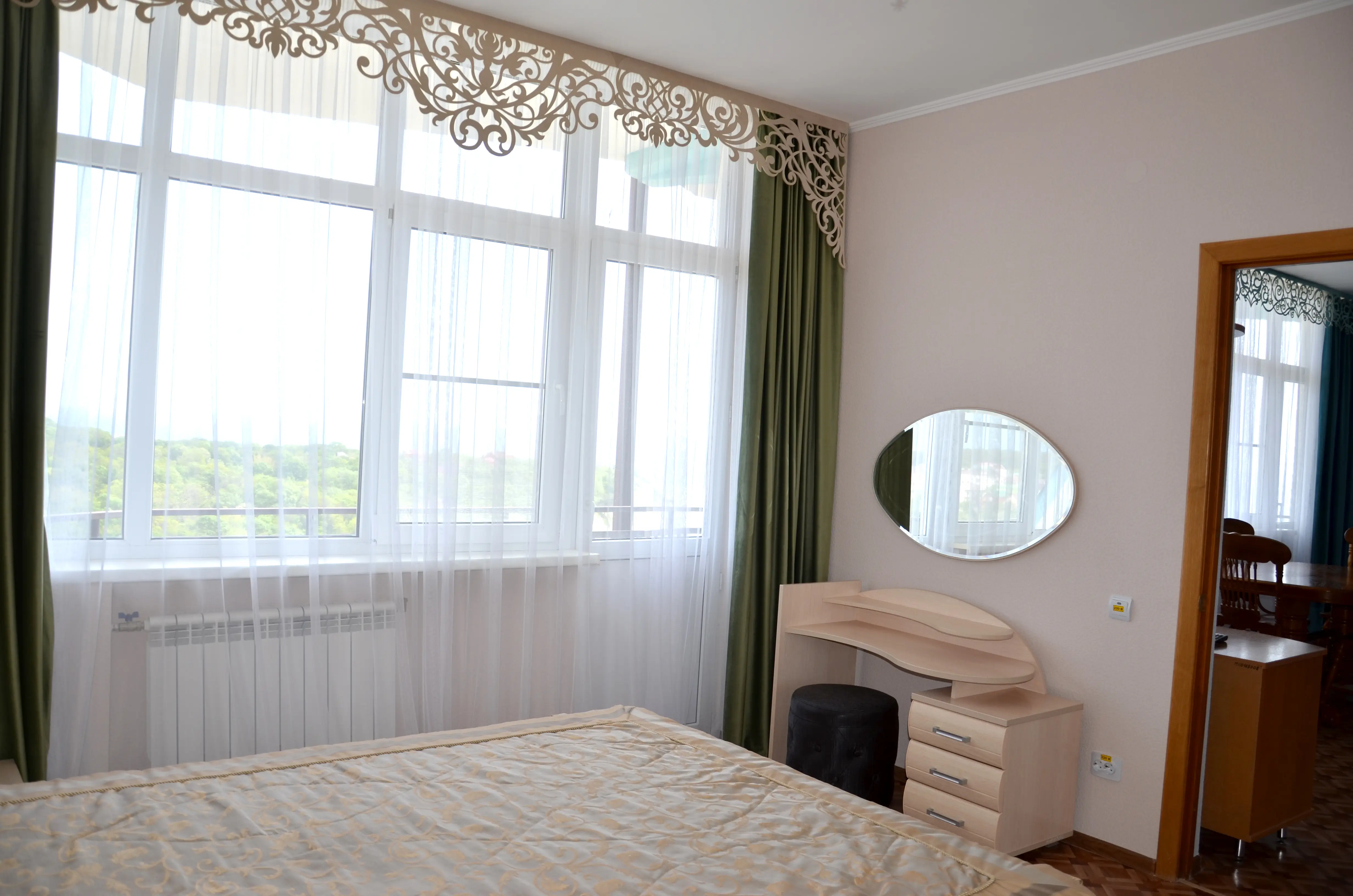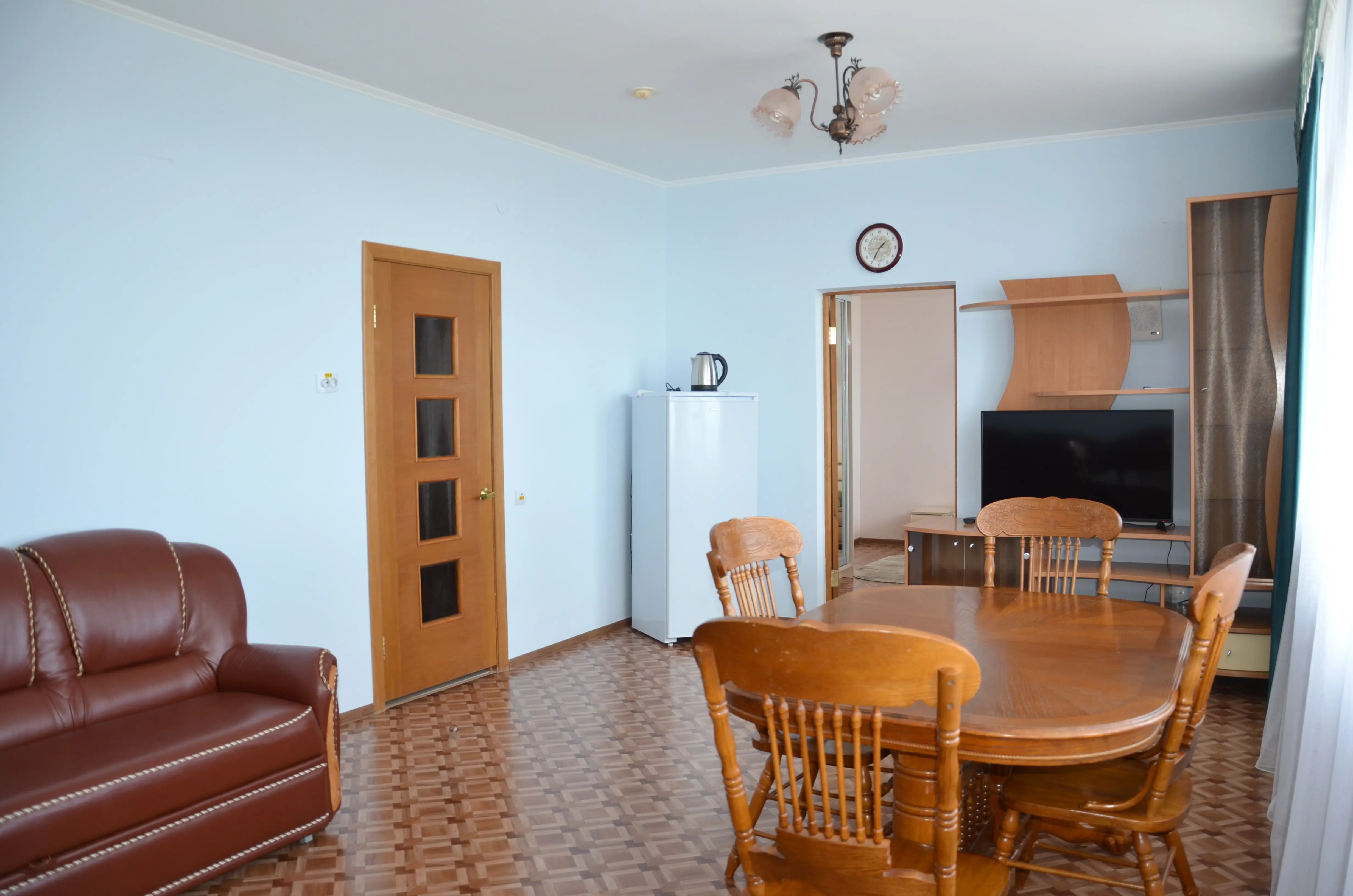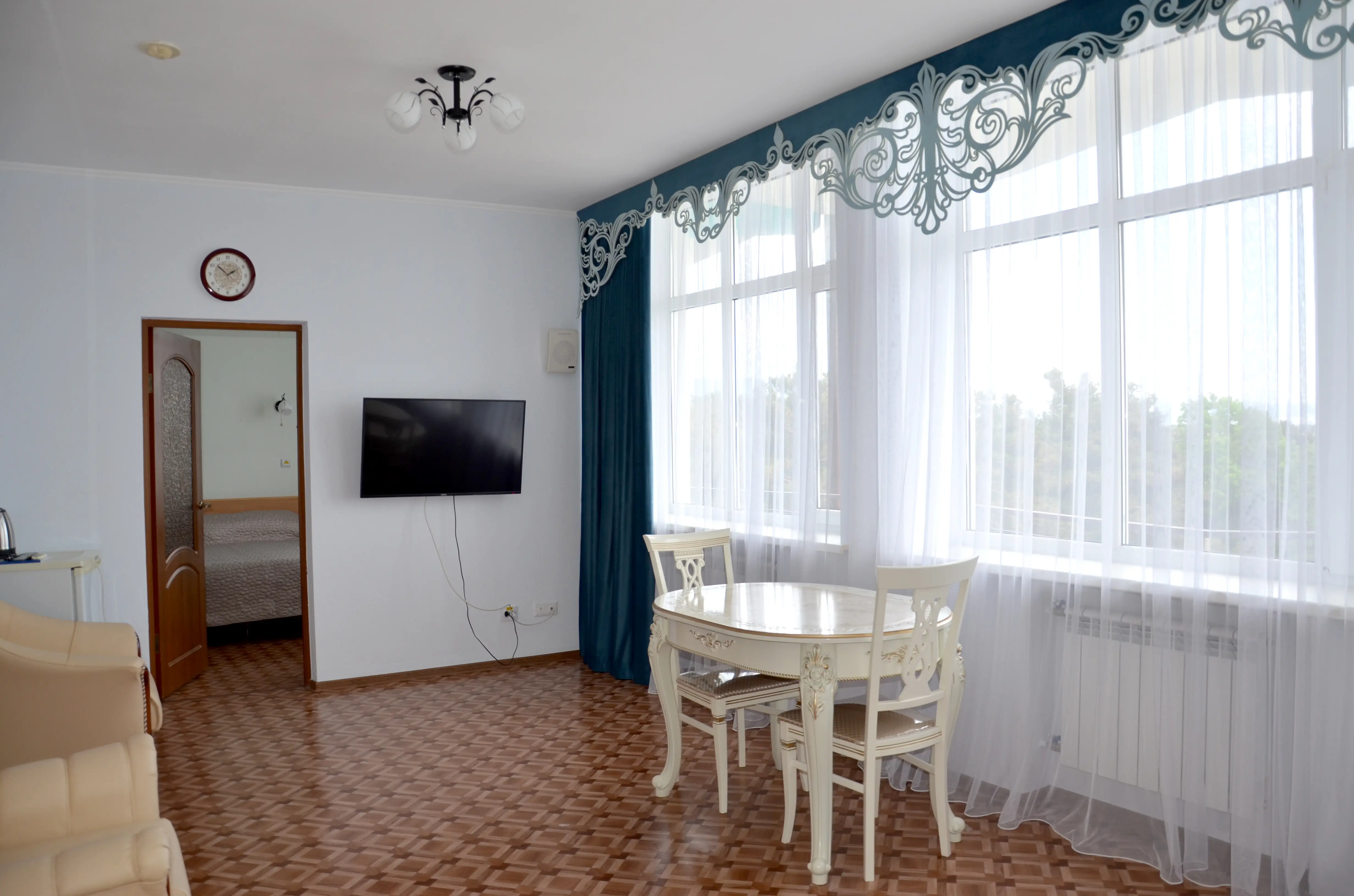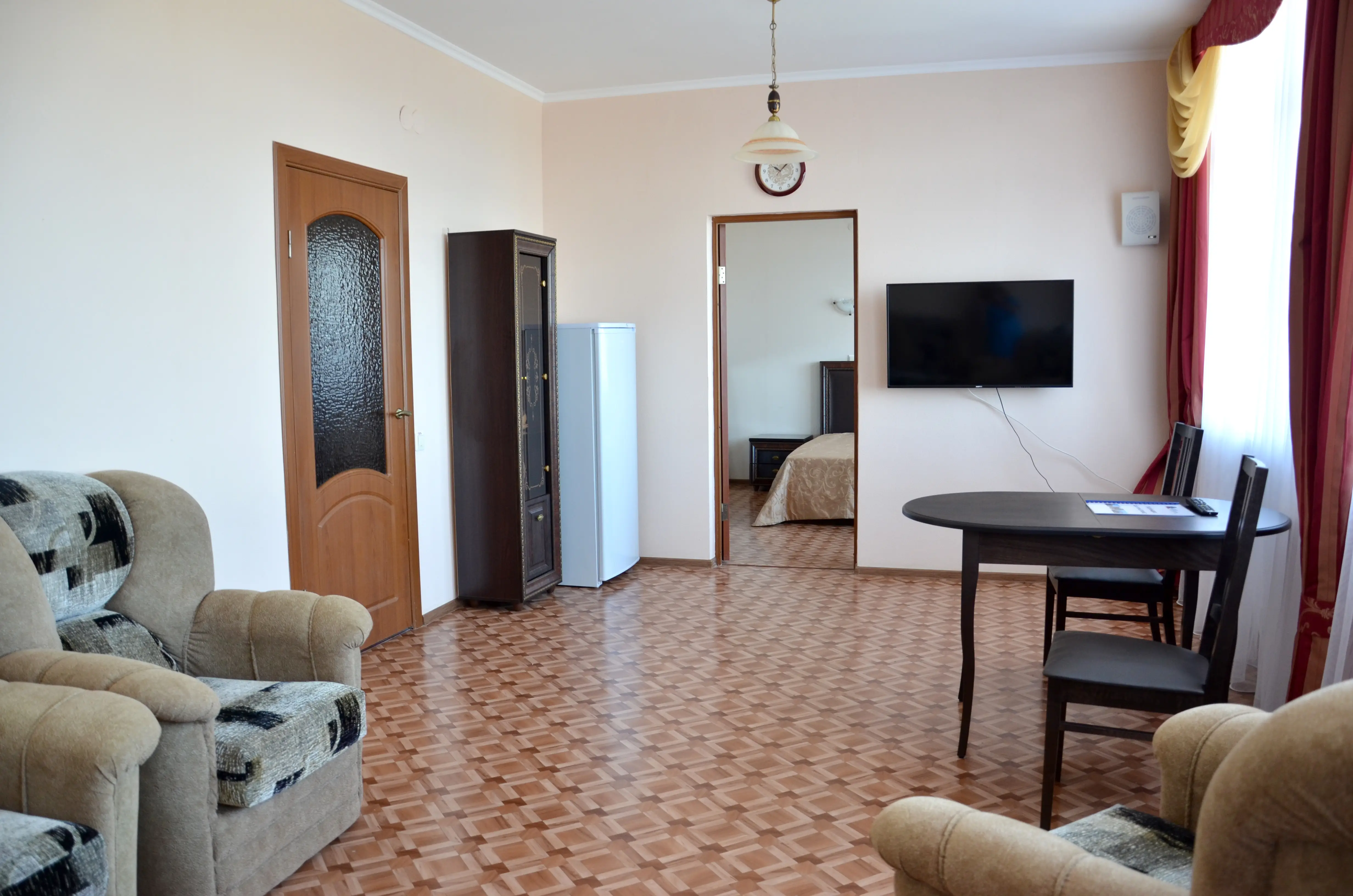 Комфортабельный светлый номер из 2 комнат площадью 23 и 14 кв.м., разделенных дверью, где будет удобно и комфортно отдыхать . В ''Люксе'' есть все необходимое для проживания и отдыха. По всему периметру номера – балкон, выход на балкон из гостиной и из спальни, на балконе – летняя мебель ( раскладной стол и два пластиковых кресла). На окнах установлены москитные сетки, предусмотрены раскладные сушилки для белья на балконе. В наличии гладильная доска, утюг, фен для сушки волос.