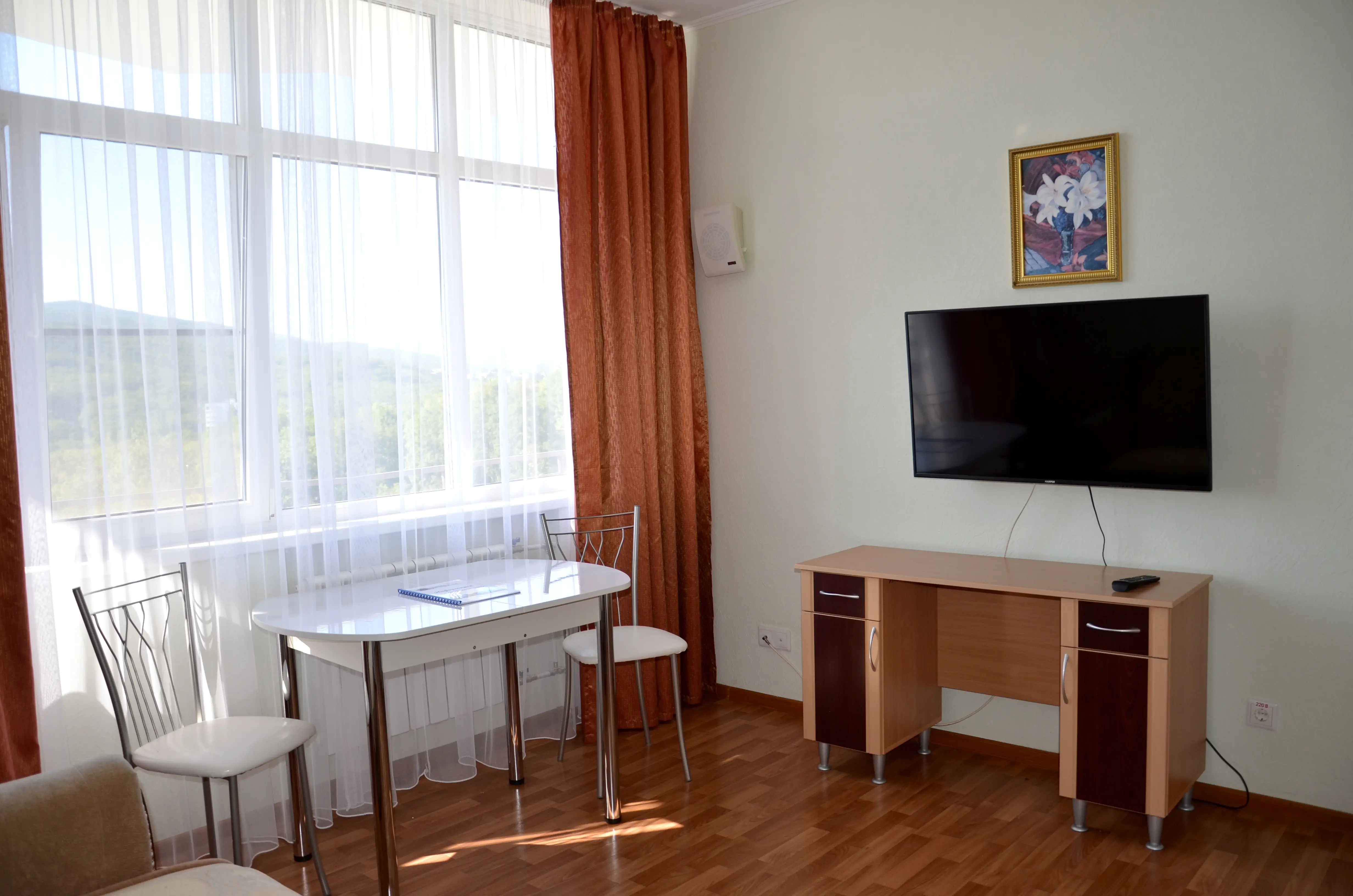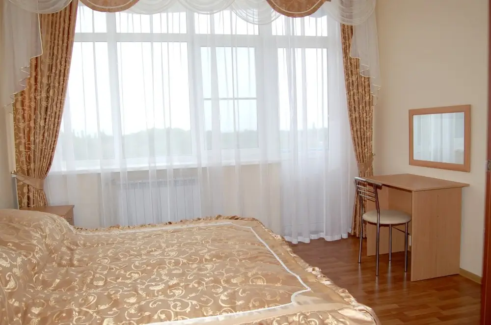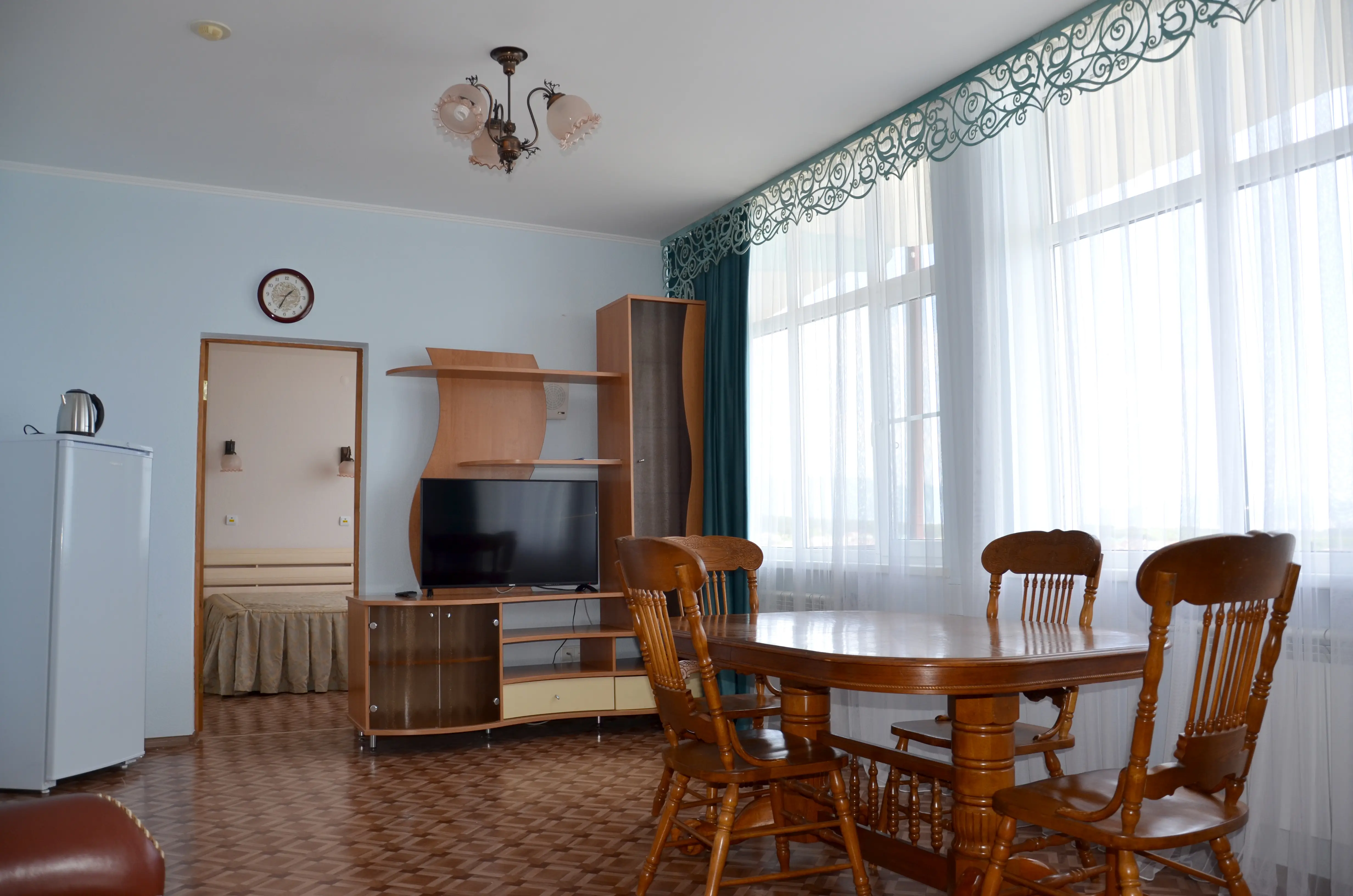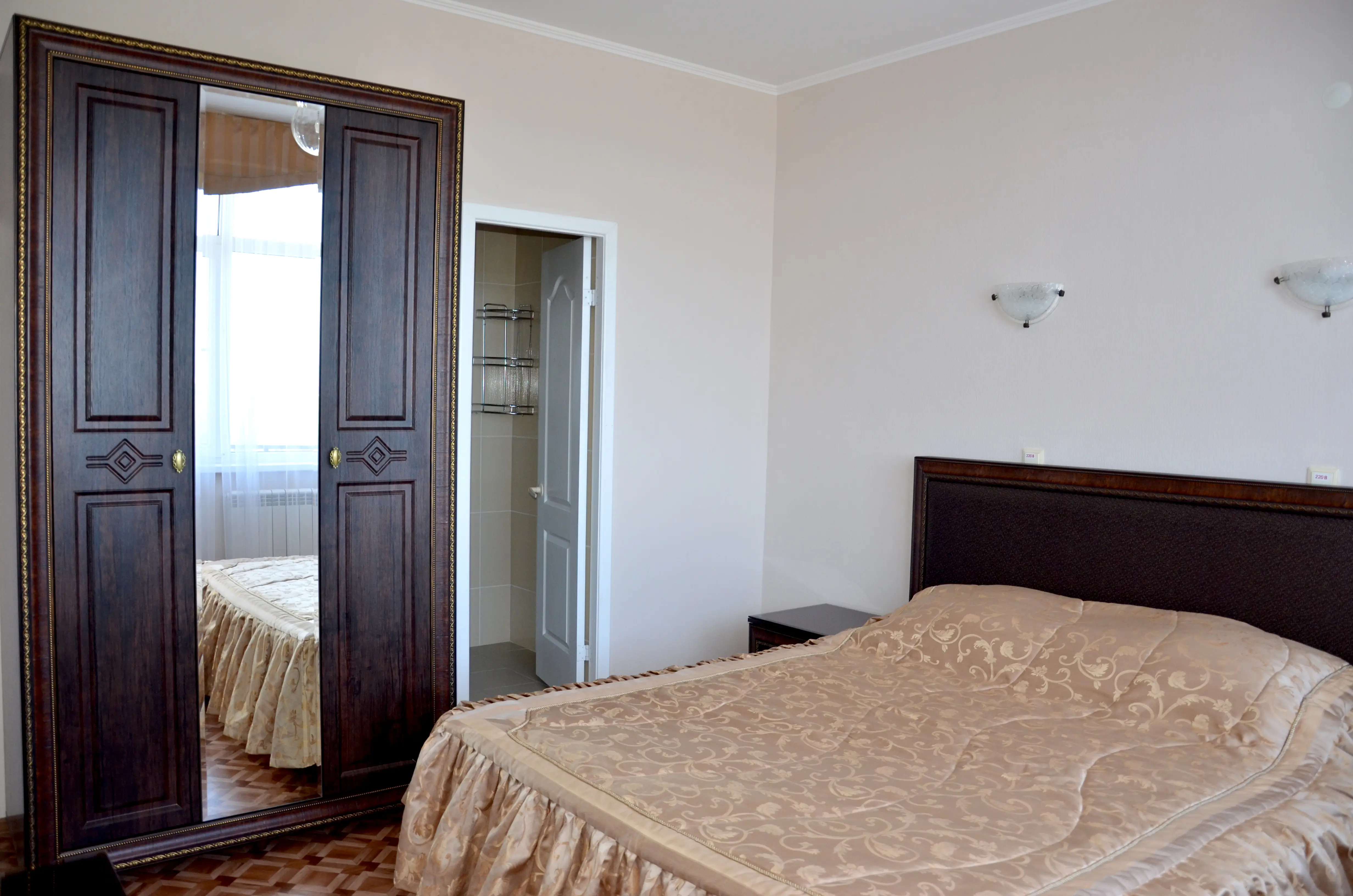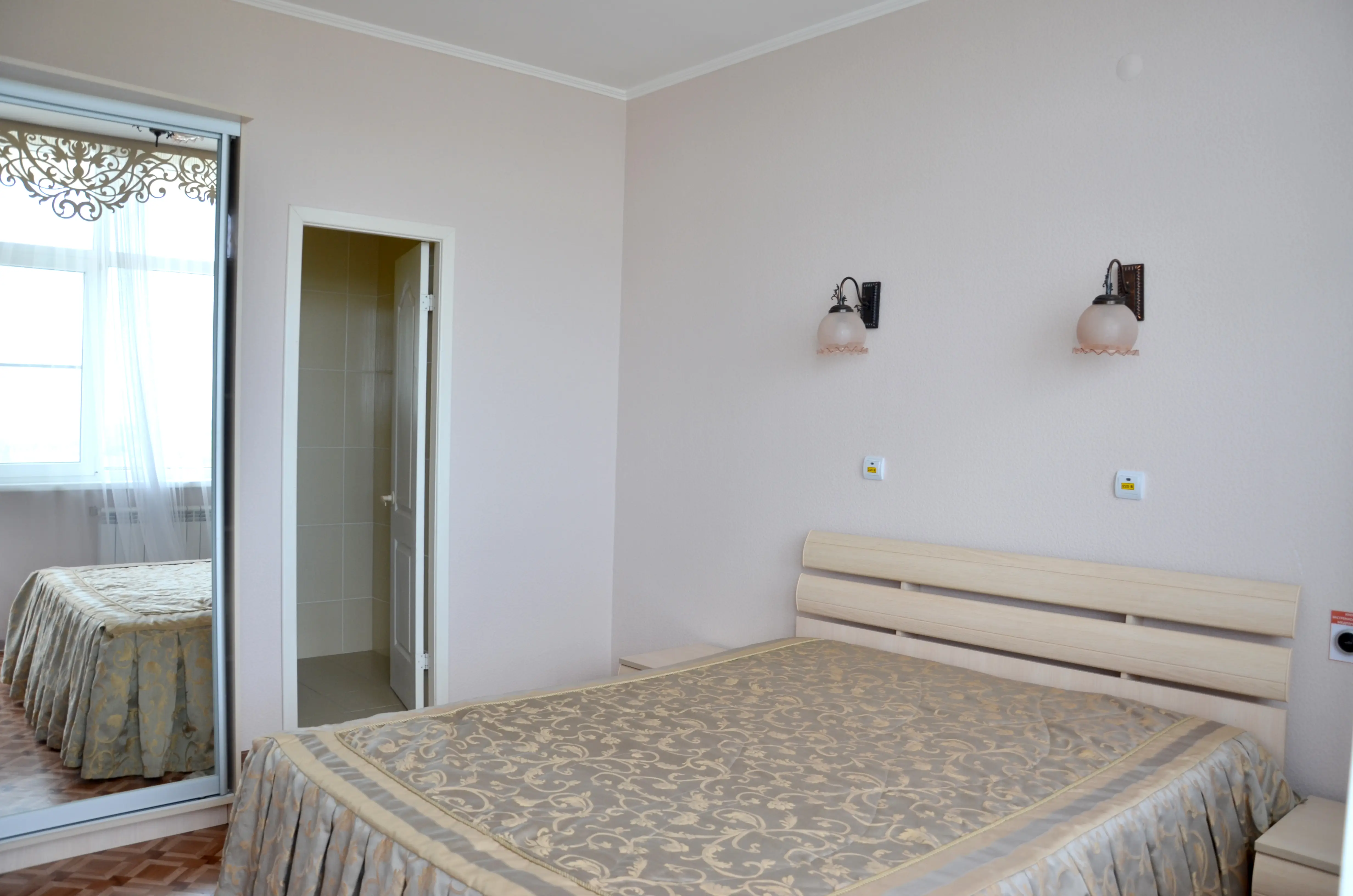 Комфортабельный светлый номер из 2 комнат площадью 23 и 14 кв.м., разделенных дверью, где будет удобно и комфортно отдыхать . В ''Люксе'' есть все необходимое для проживания и отдыха. По всему периметру номера – балкон, выход на балкон из гостиной и из спальни, на балконе – летняя мебель ( раскладной стол и два пластиковых кресла). На окнах установлены москитные сетки, предусмотрены раскладные сушилки для белья на балконе. В наличии гладильная доска, утюг, фен для сушки волос.