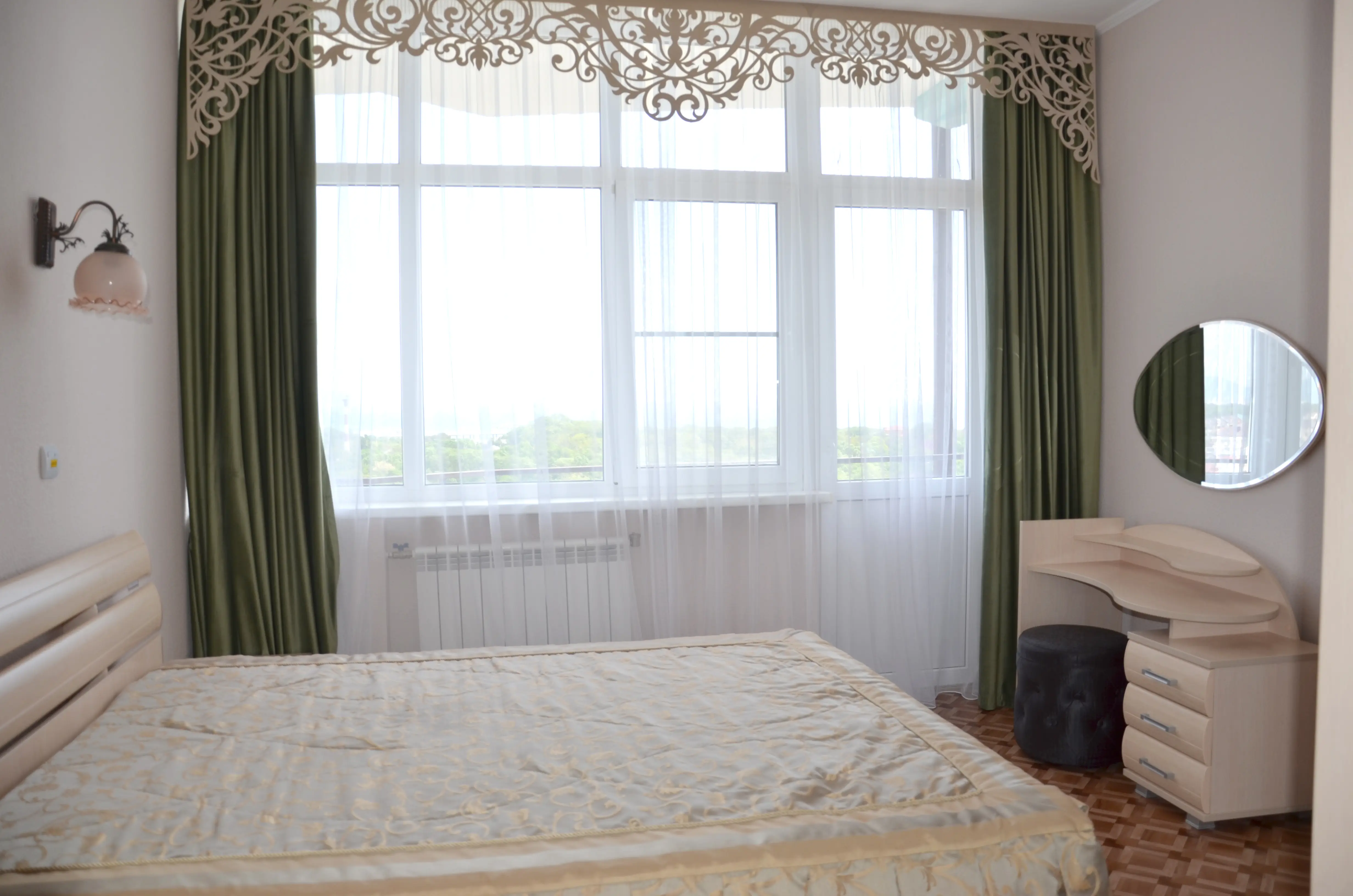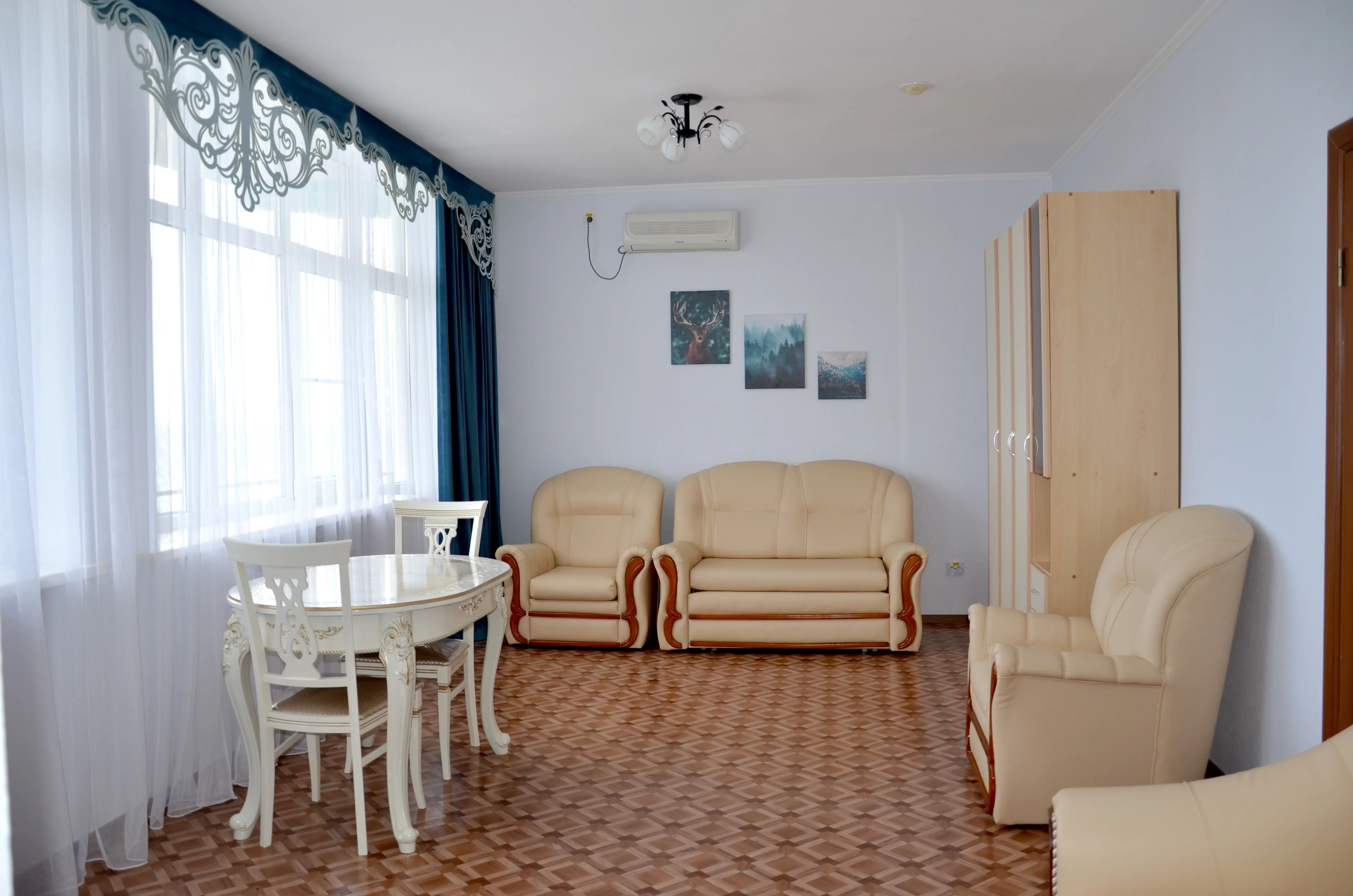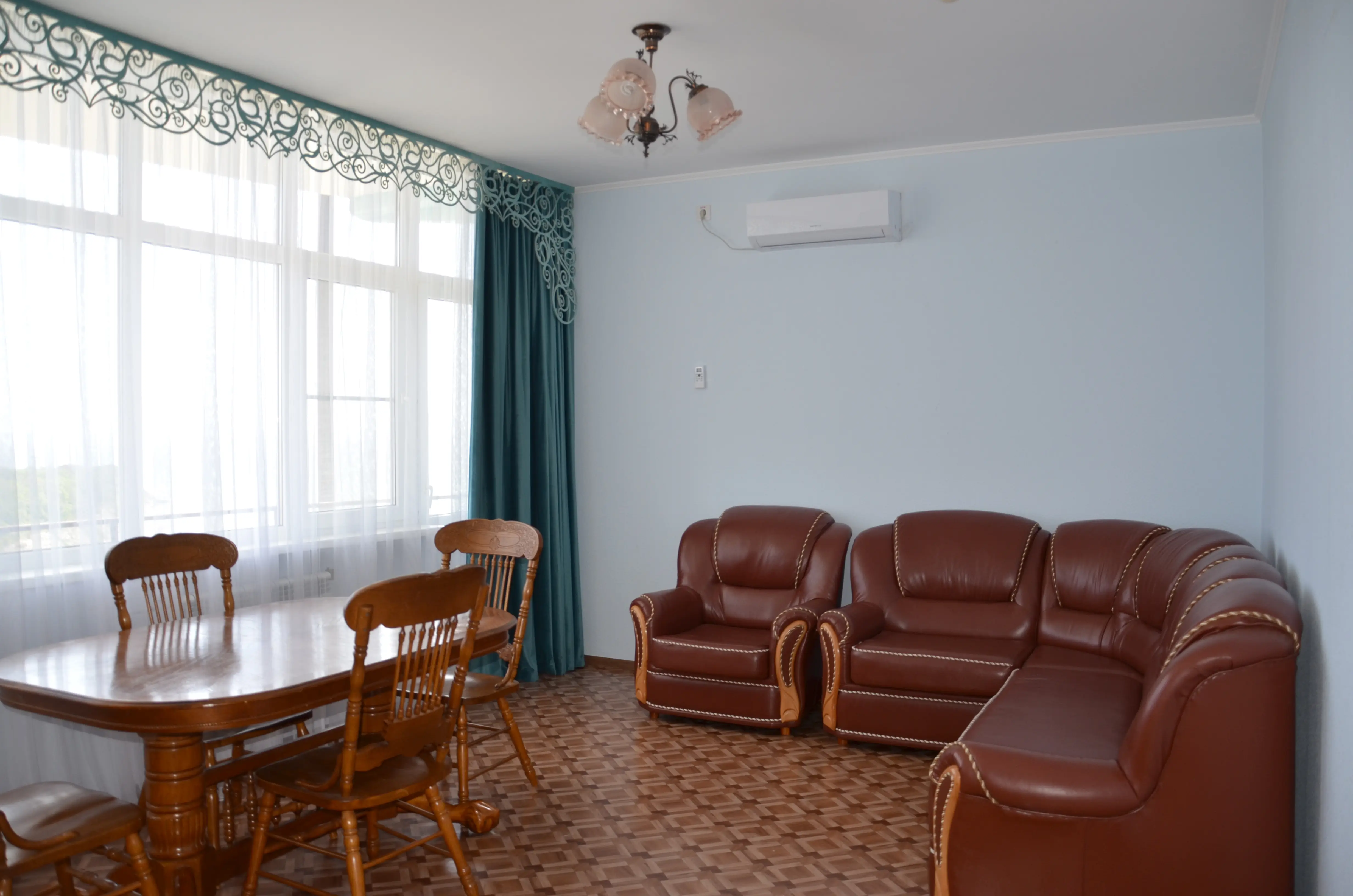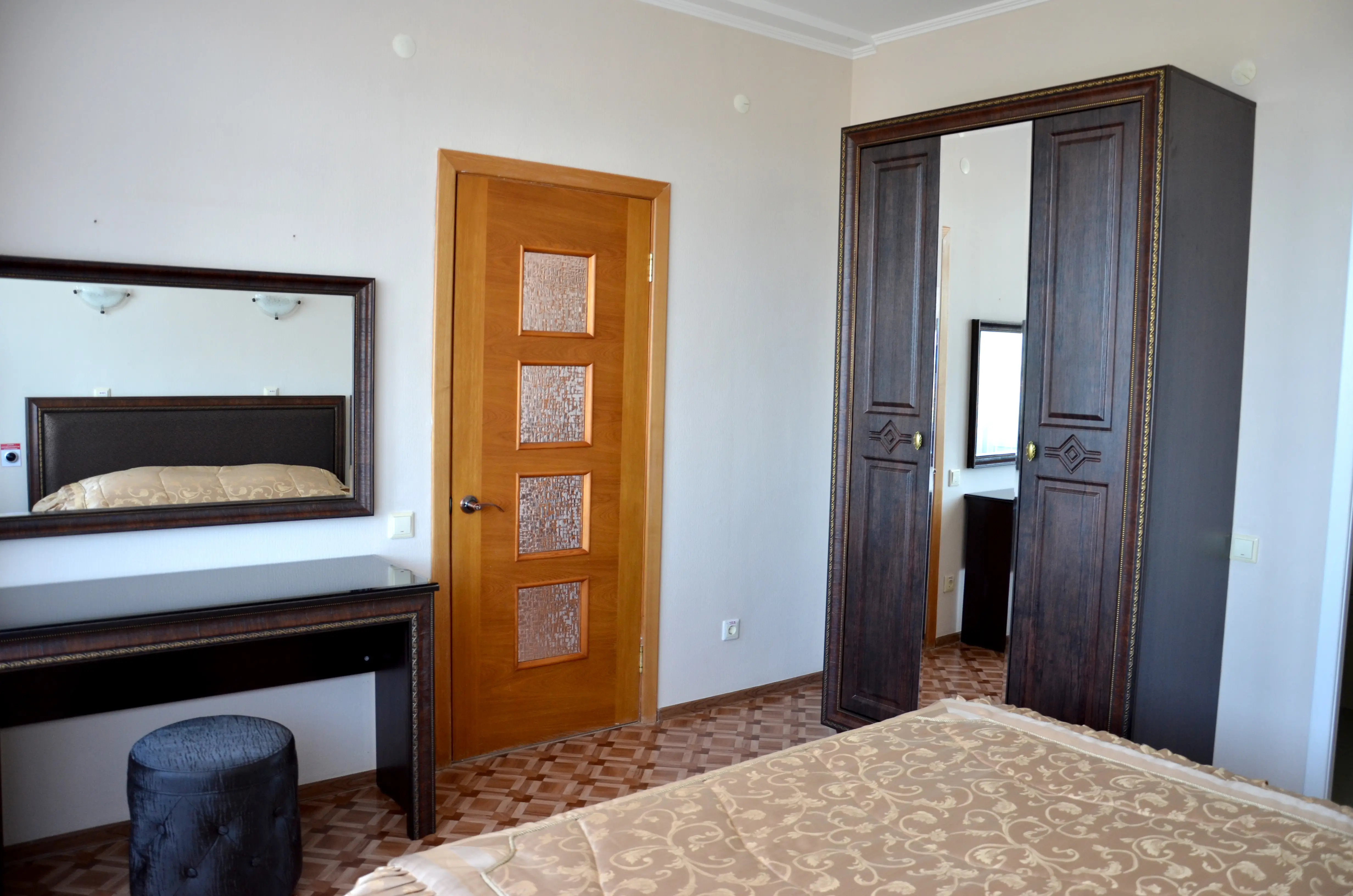 Комфортабельный светлый номер из 2 комнат площадью 23 и 14 кв.м., разделенных дверью, где будет удобно и комфортно отдыхать . В ''Люксе'' есть все необходимое для проживания и отдыха. По всему периметру номера – балкон, выход на балкон из гостиной и из спальни, на балконе – летняя мебель ( раскладной стол и два пластиковых кресла). На окнах установлены москитные сетки, предусмотрены раскладные сушилки для белья на балконе. В наличии гладильная доска, утюг, фен для сушки волос.